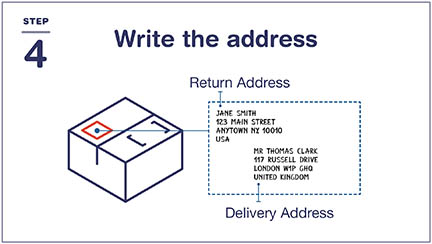 Print your return address and the delivery address clearly, on the same side of the box where you’ll be putting your postage, to help ensure your package is delivered on time.